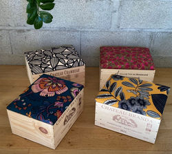 Création : choix de la carcasse (plusieurs diamètres disponibles), sélection du ou des tissus (ameublement, vintage, etc.).